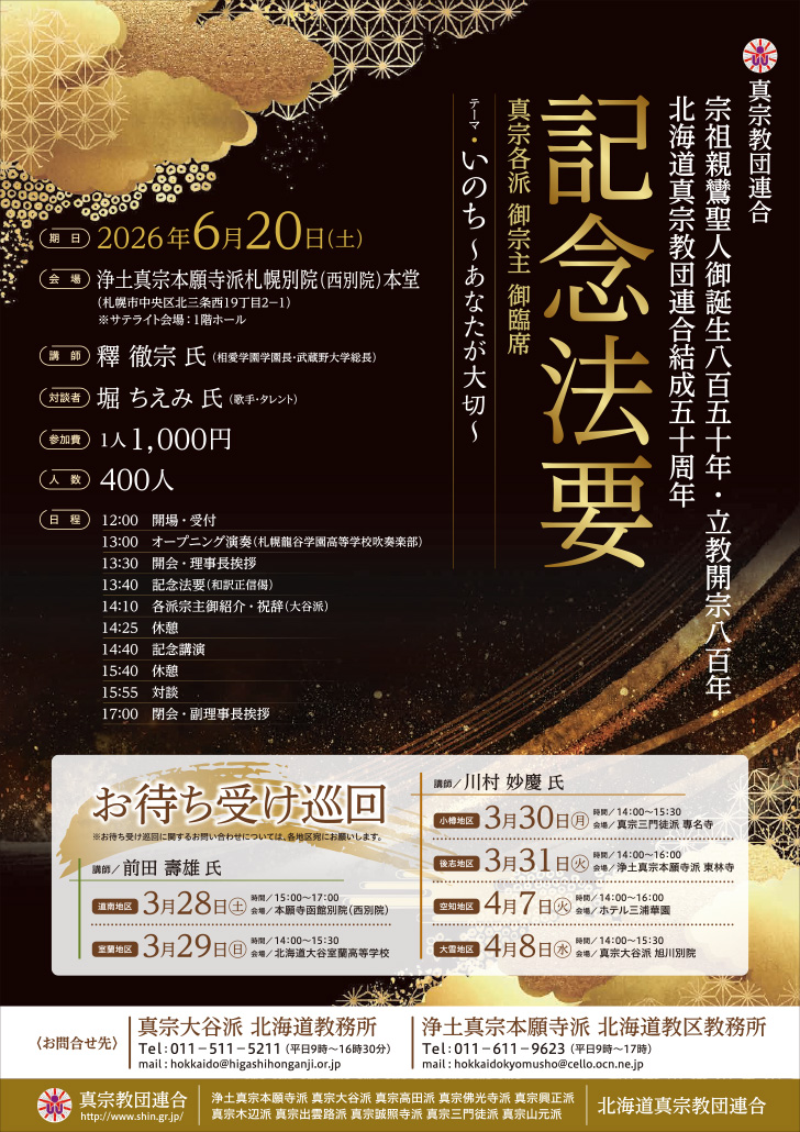 このたび、宗祖親鸞聖人御誕生850年・立教開宗800年慶讃並びに真宗教団連合結成50年を機縁として、北海道支部において以下のとおり記念法要を厳修いたします。