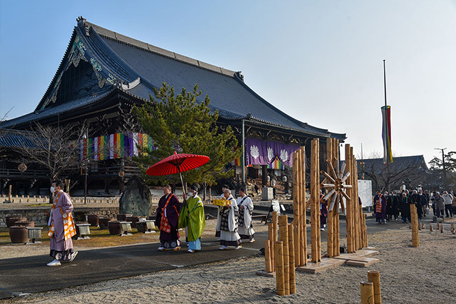 御開山親鸞聖人は弘長2年(1262年)11月28日(推歩陽暦1月16日)に90歳のご生涯を終えられました。そのご命日を機縁に、本山専修寺では1月9日から16日の間、聖人が出会われた念仏の教えに、私たちも遇いえるご縁をいただいたことをよろこび、その恩徳に報いる報恩講(お七夜さん)が勤まります。法会中、本山ではさまざまな行事が実施されます。